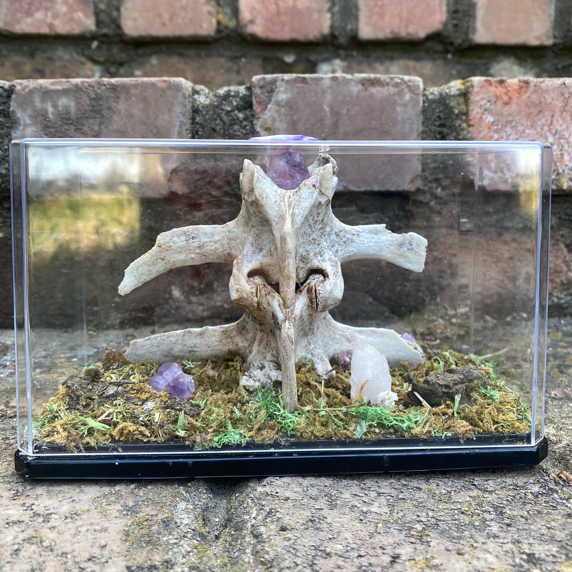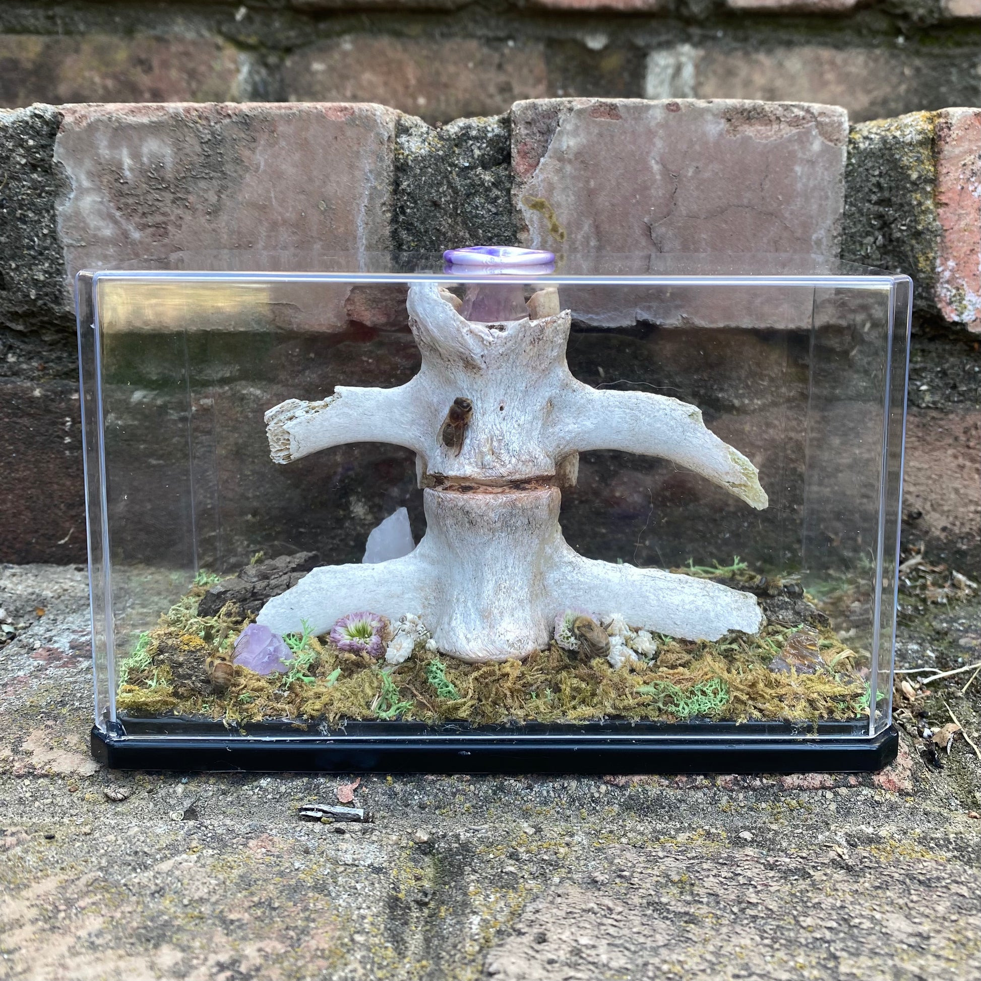 A fragment of calf vertebrae adorned with four honeybees, tree bark, dried flowers, amethyst and quartz resting upon a mossy base.