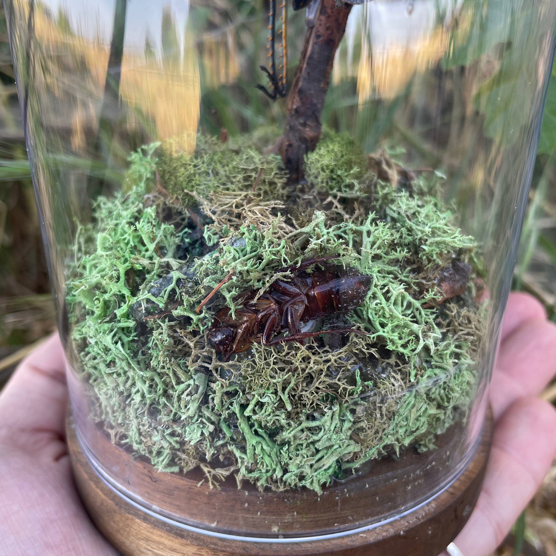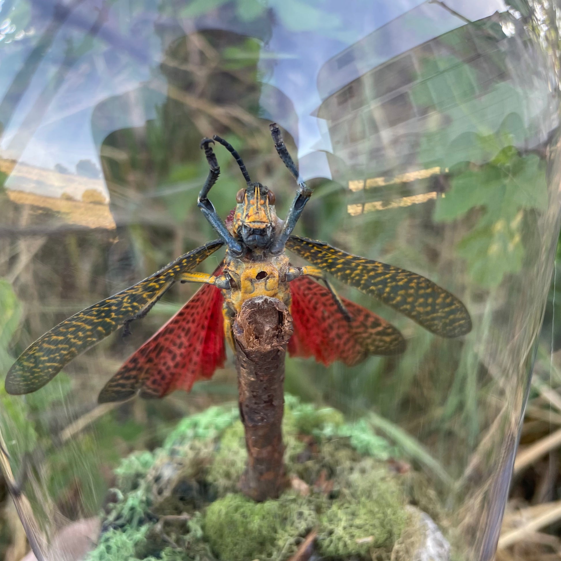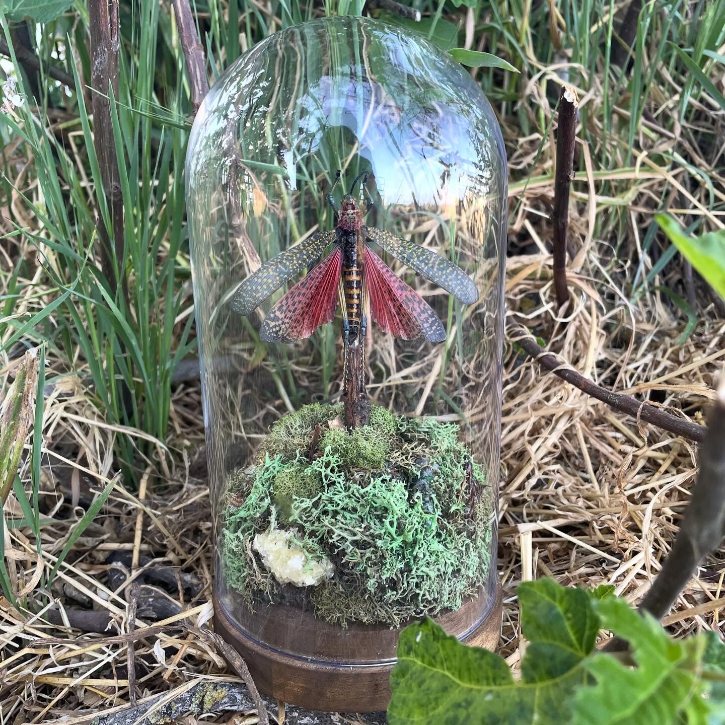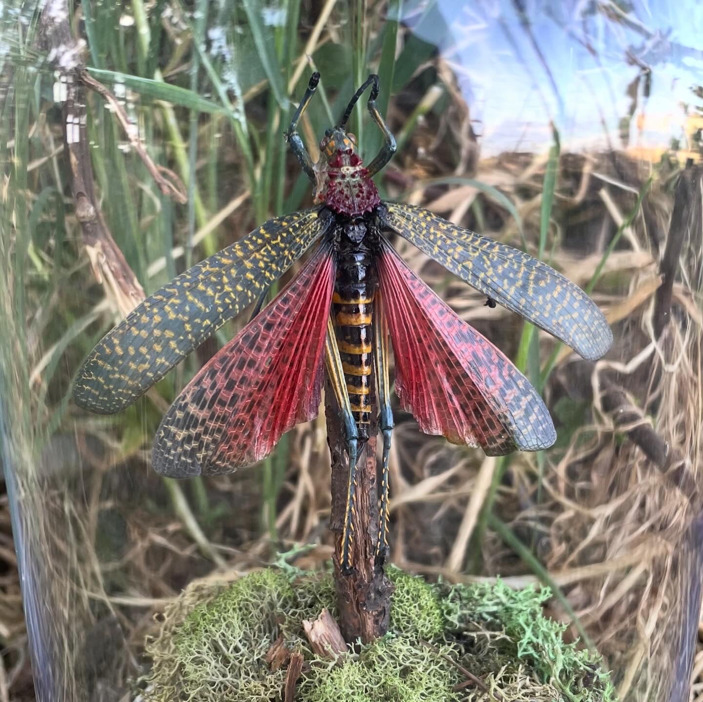 Beautiful Milkweed Locust from Madagascar displayed in a 6 inch dome. The base is adorned with moss, minerals, and a German Cockroach.