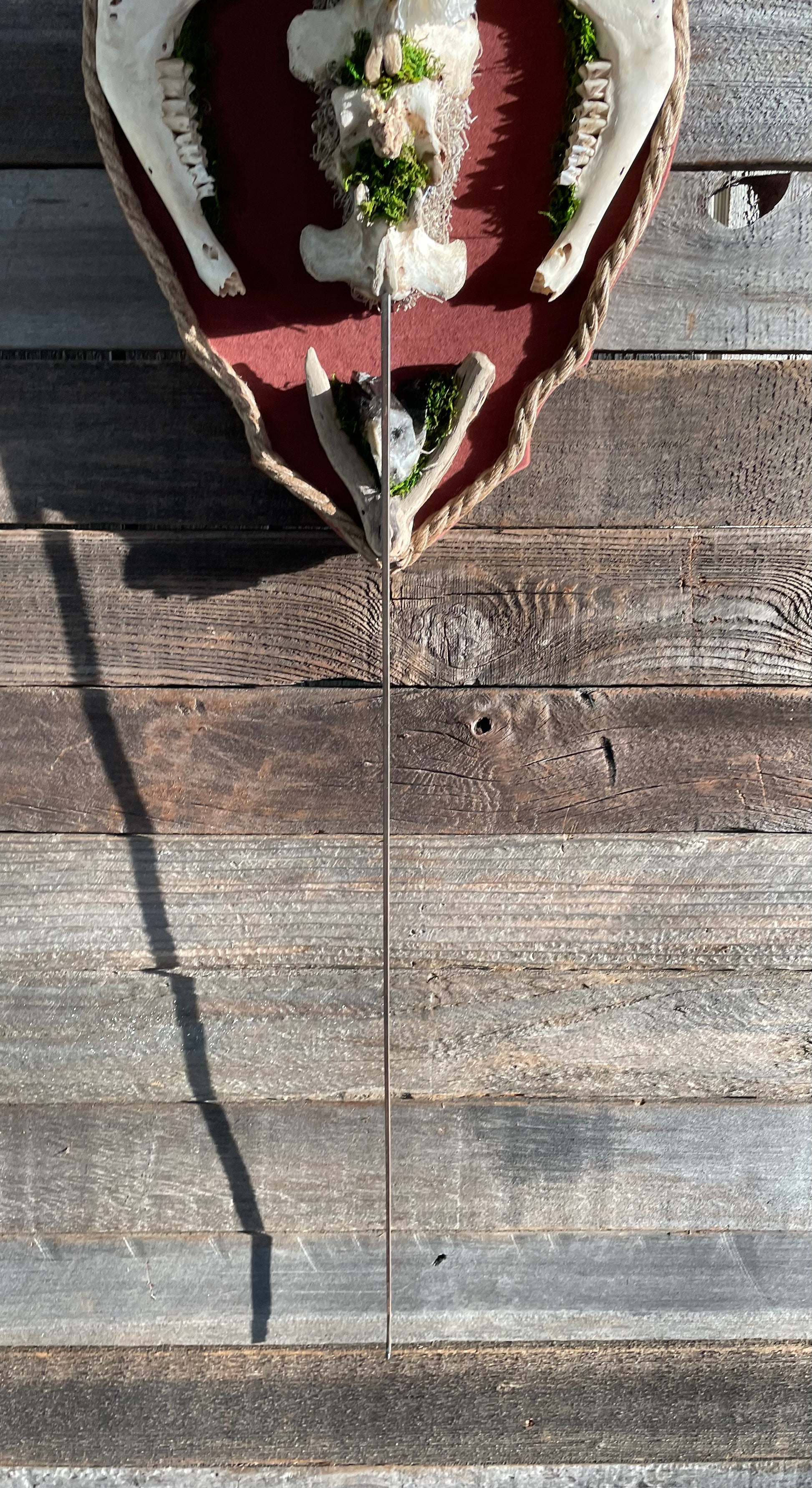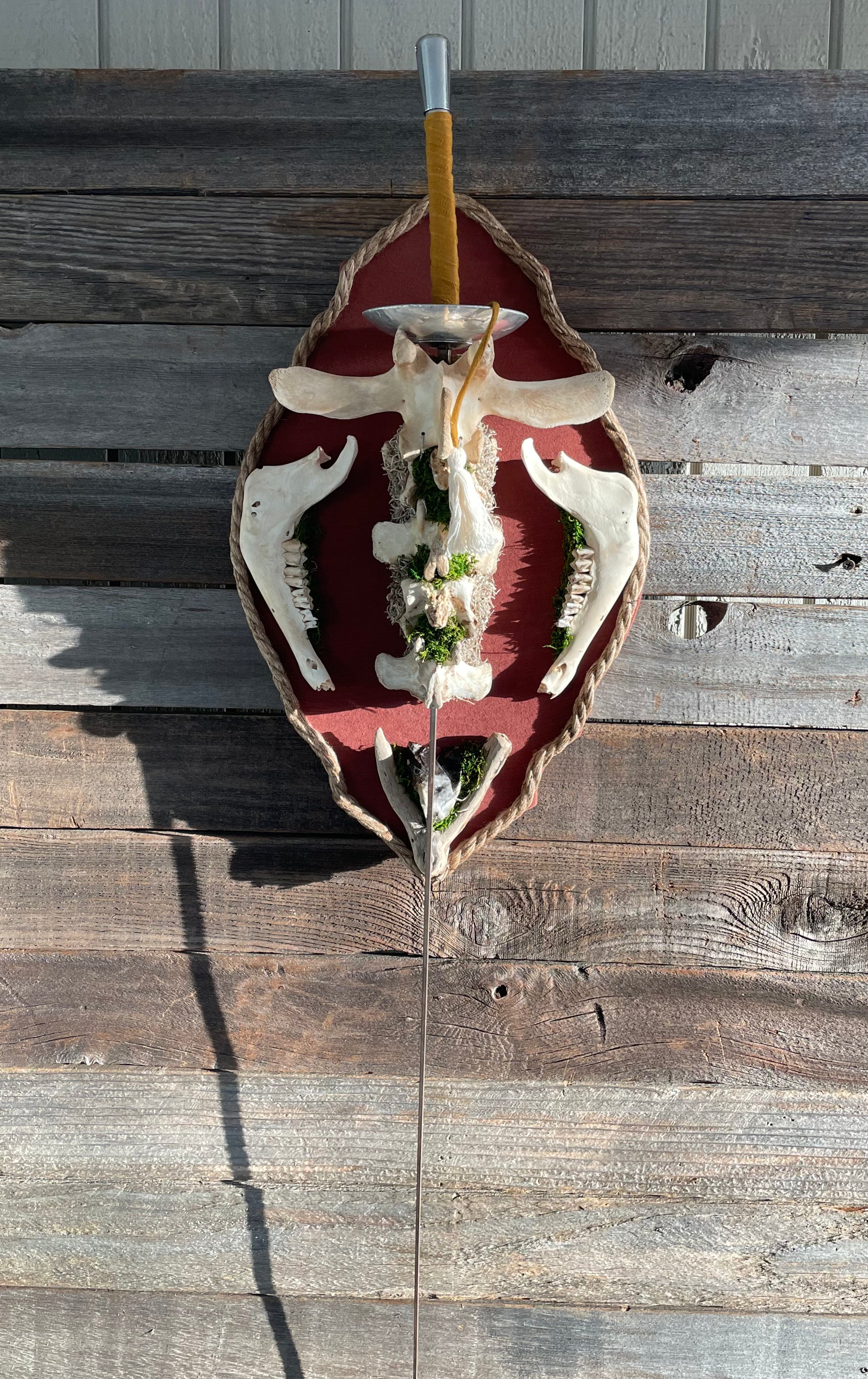A vintage fencing sword sheathed within a scabbard assembled from bovine vertebrae. Bordered with two jawbone pieces, driftwood, smokey quarts and moss.
