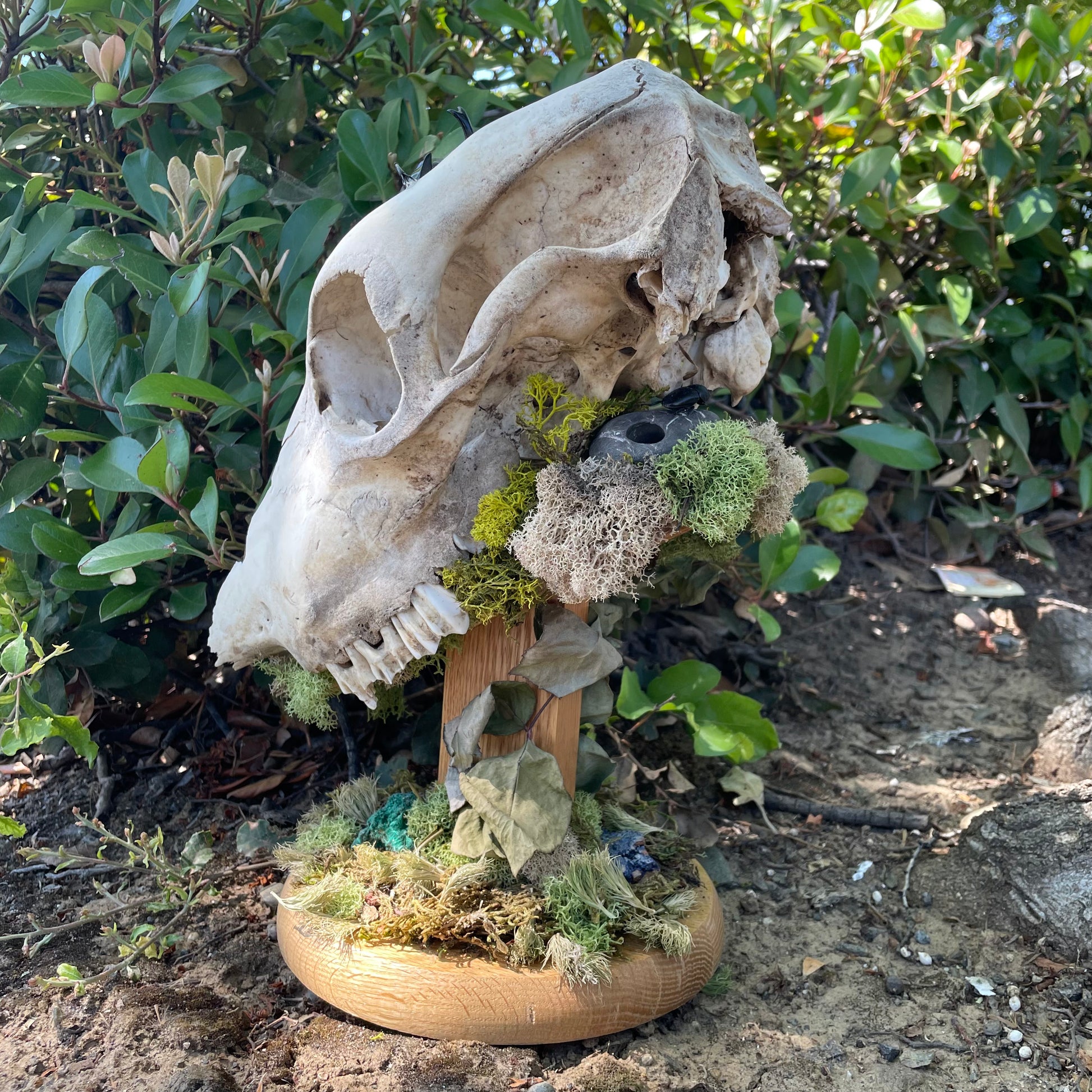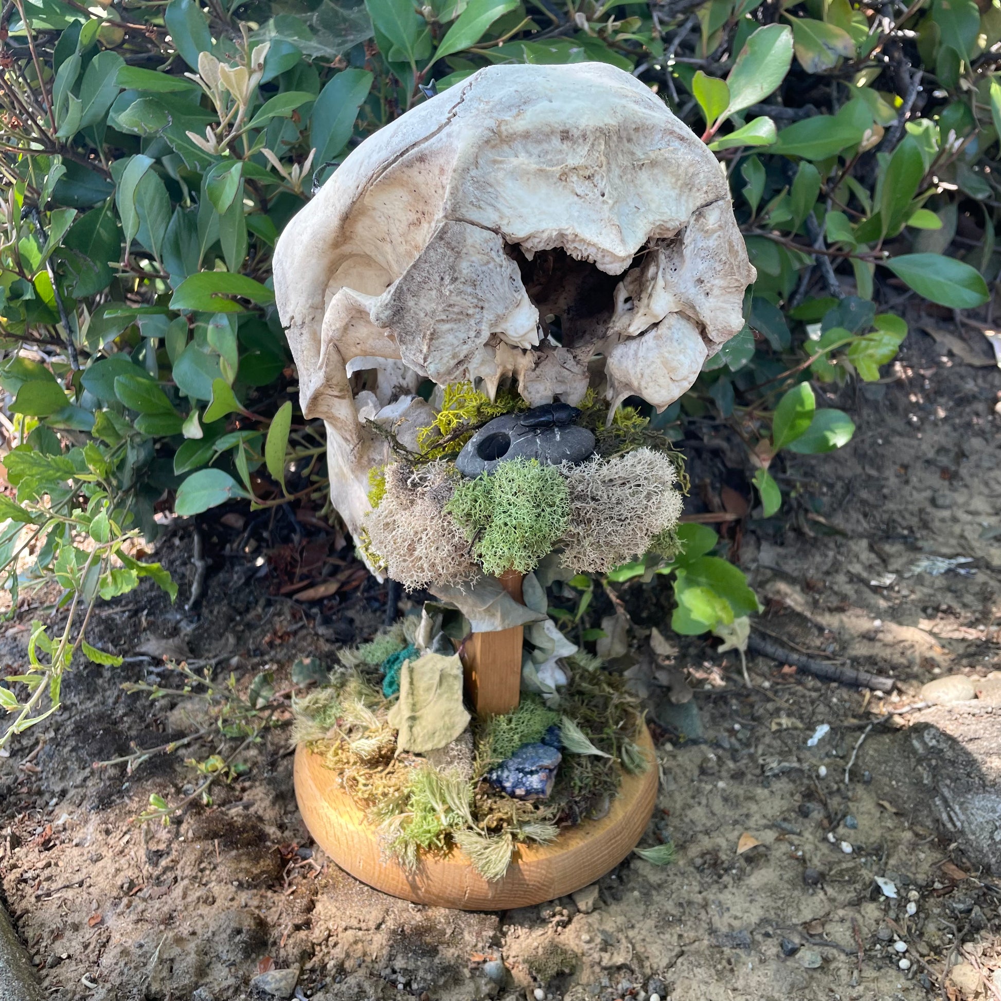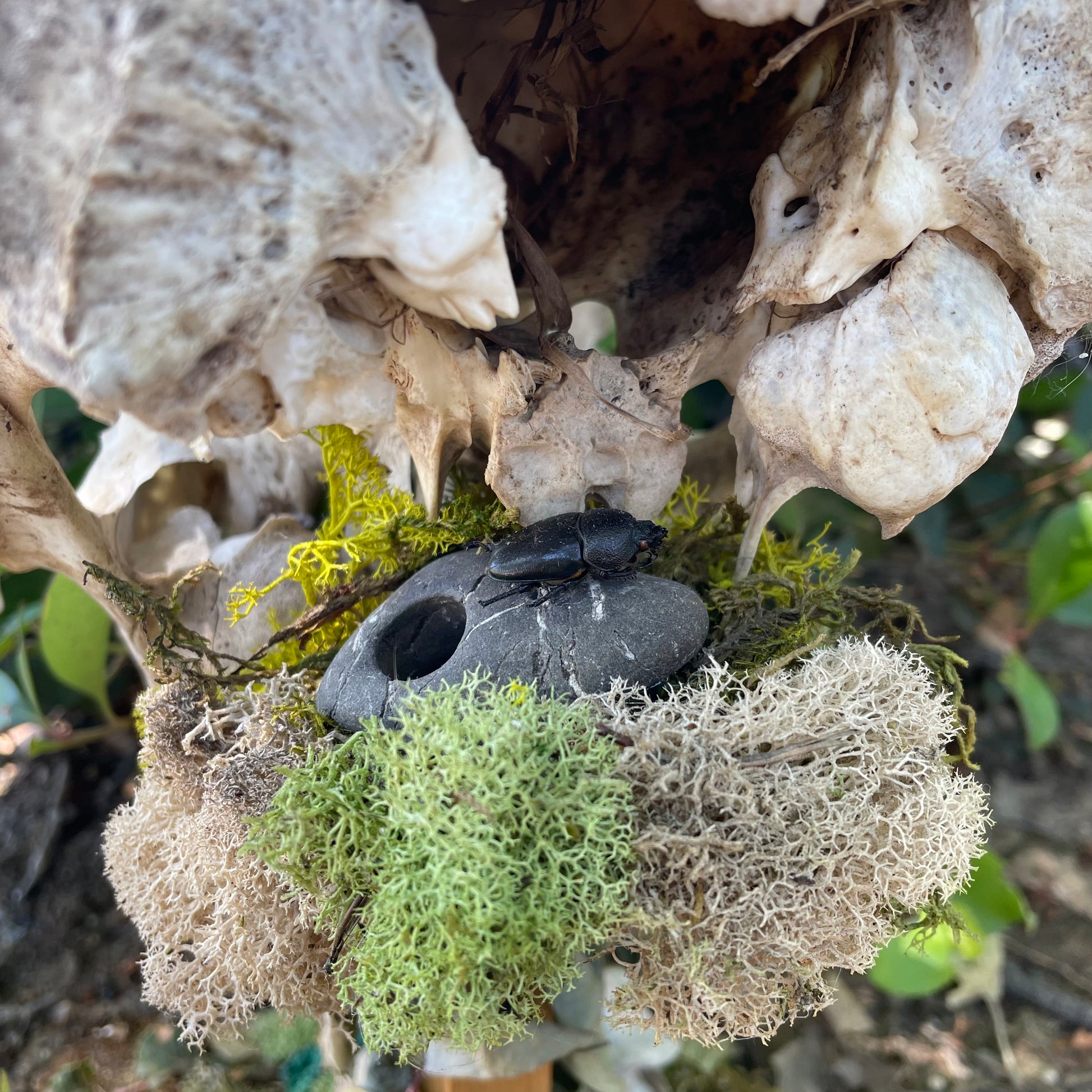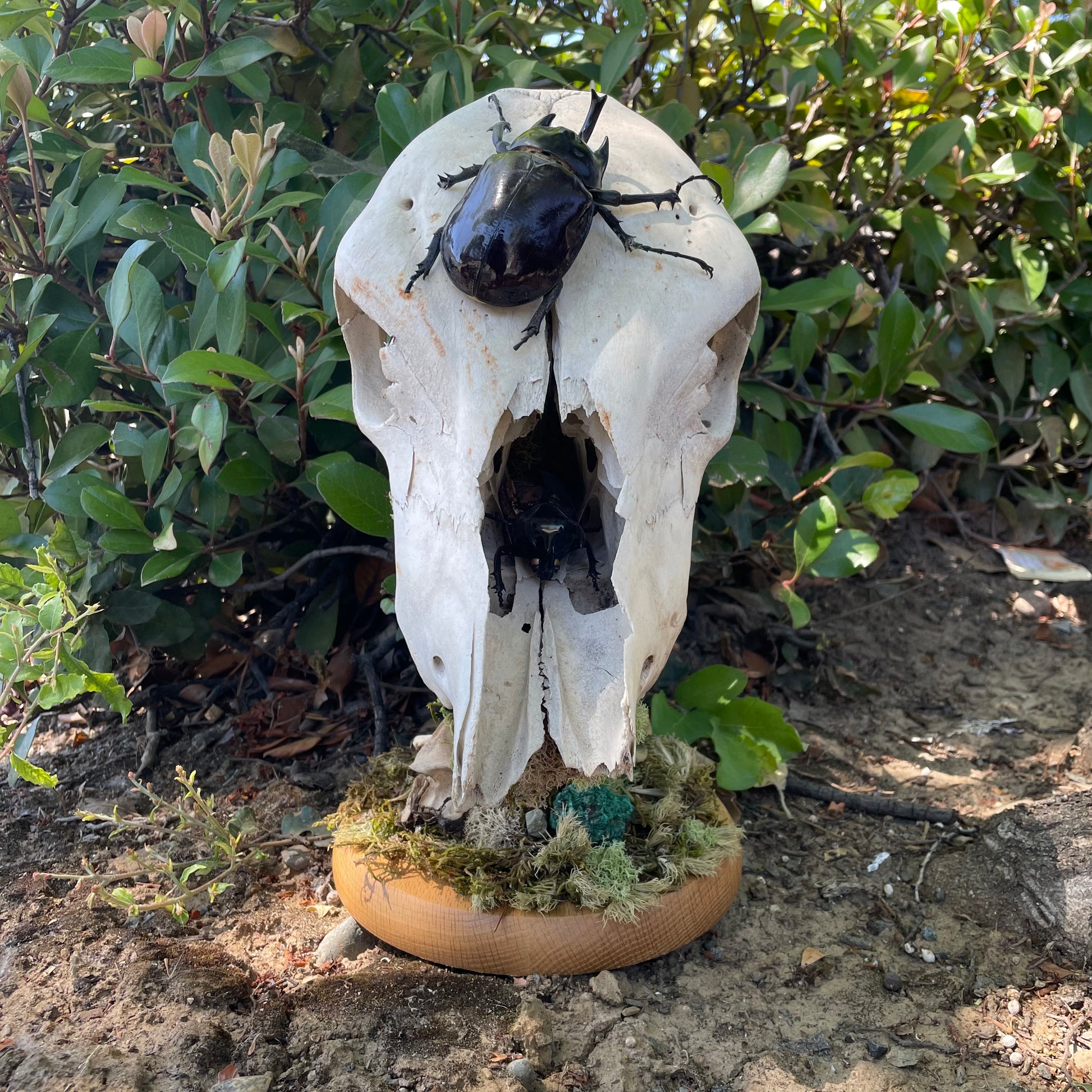 A Cow skull adorned with a Rhinoceros Beetle with an Atlas beetle within the nasal cavity. The base features moss, Azurite and Malachite.