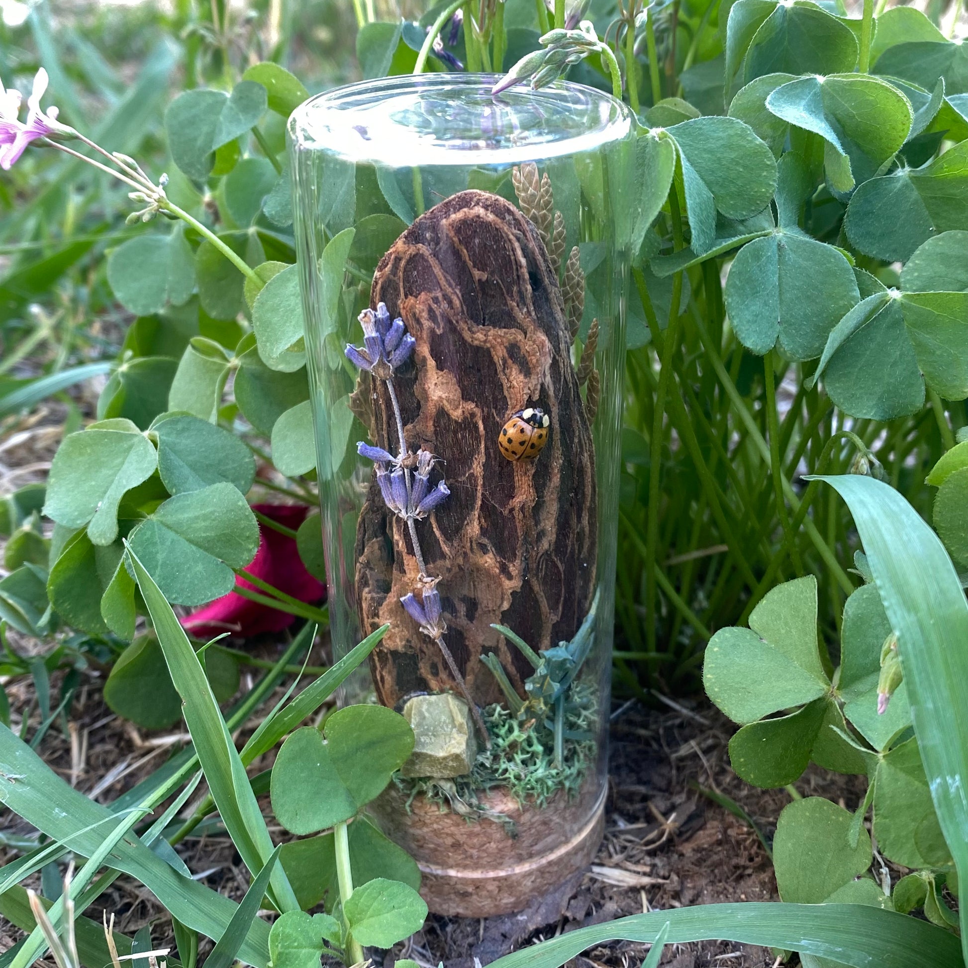 Lady bug and assassin bug climbing a piece of redwood. Adorned in lavender, dried ferns and a variety of stones.