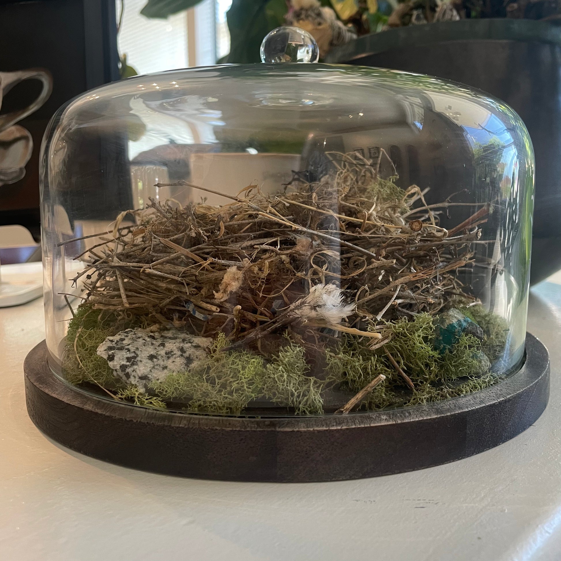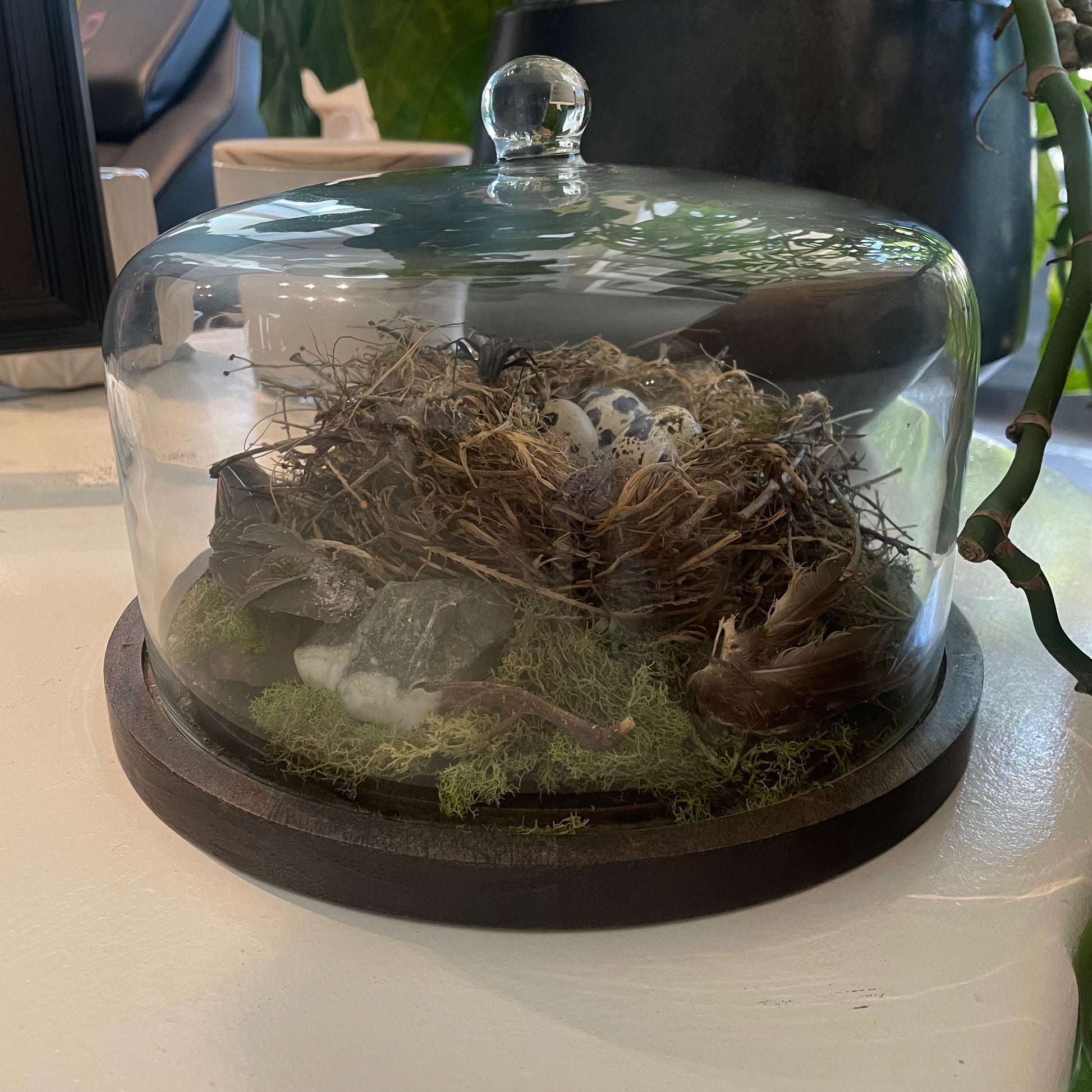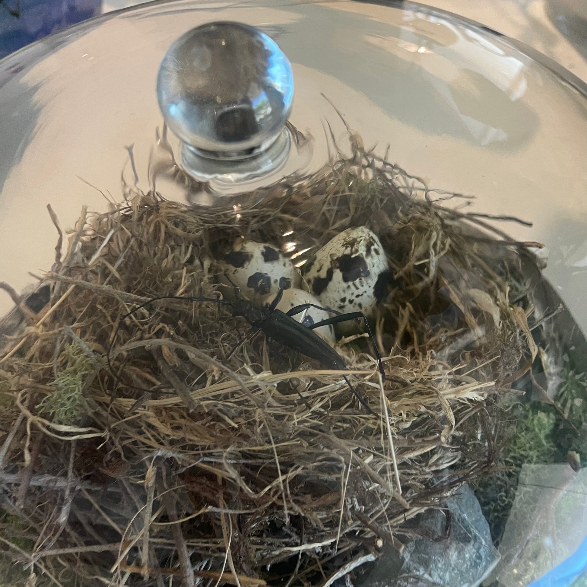 Set within a dome rests a bird nest with a severed wing, a mummified beak and hind-leg, quail eggs, minerals and a Longhorn Beetle.