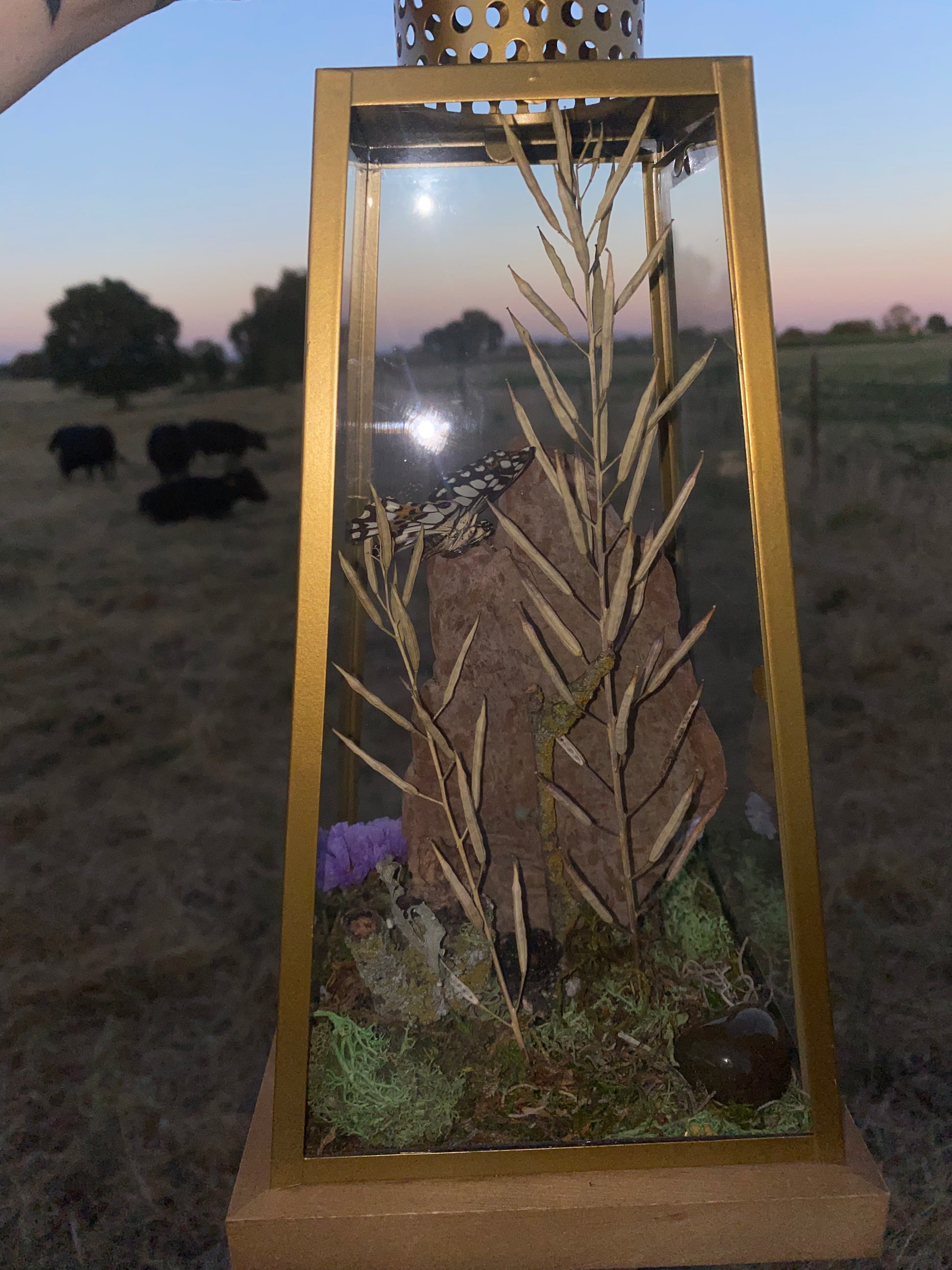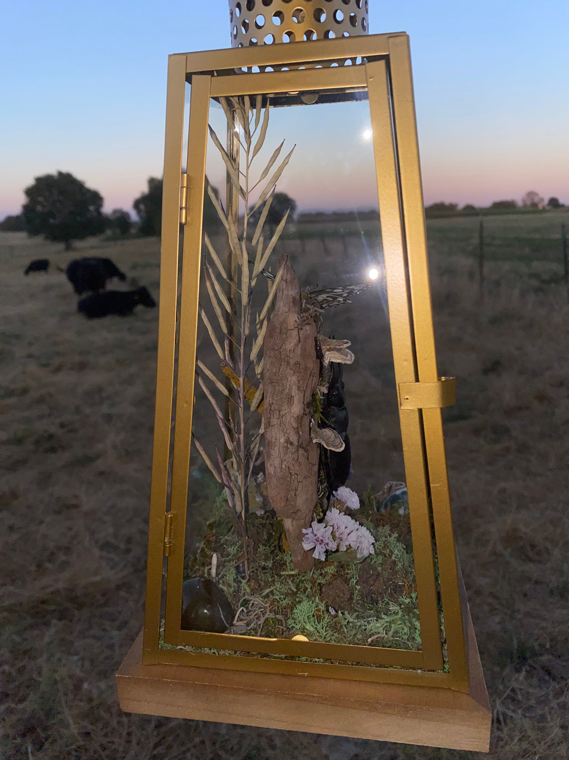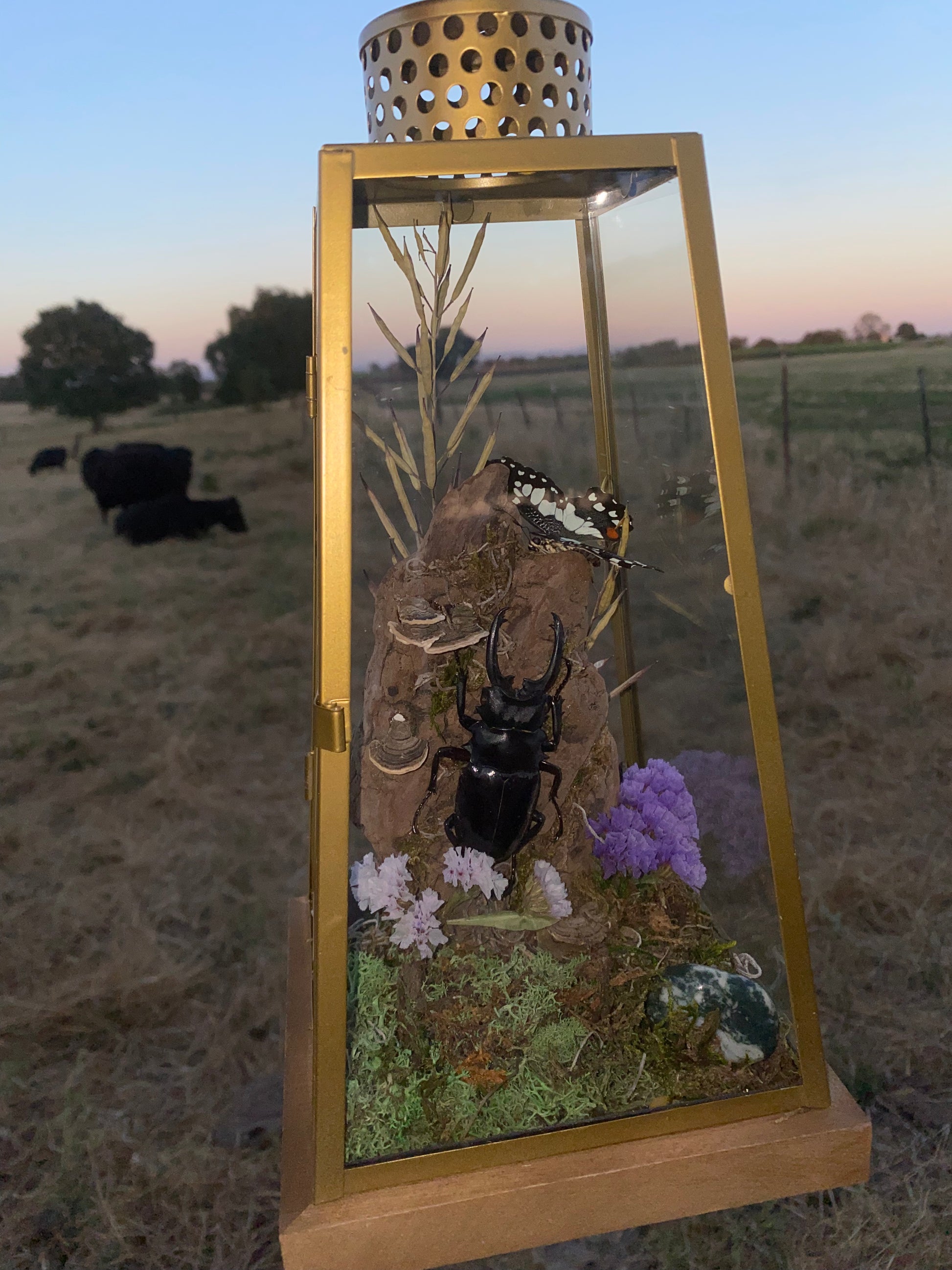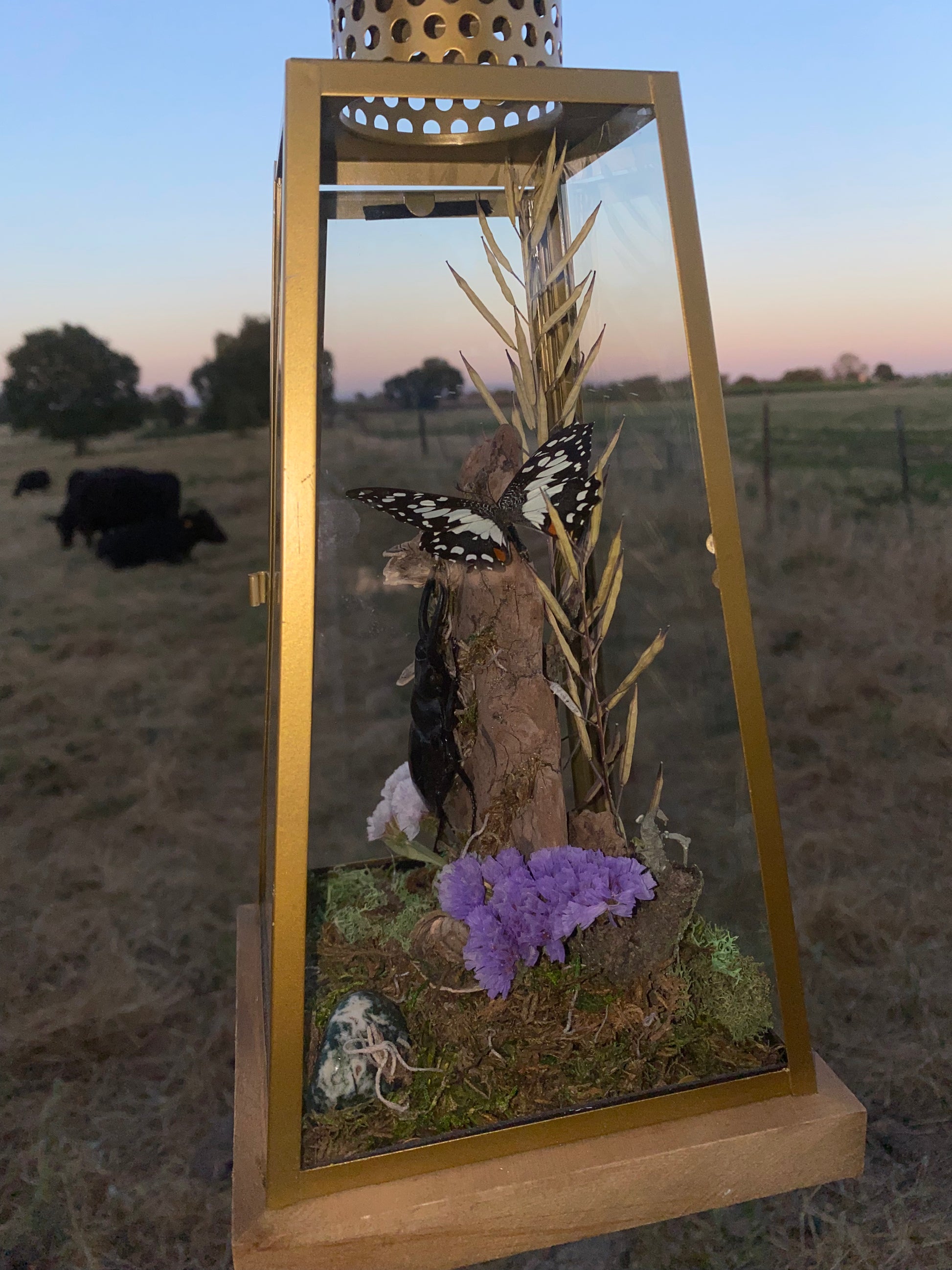 Within a gold lantern lies a stag beetle, a lime butterfly, turkey tail mushrooms, crystals, dried flowers and moss.